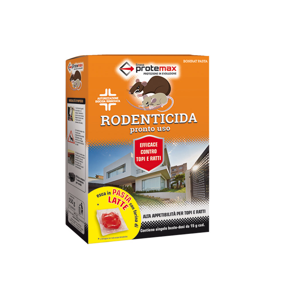 Caratteristiche: È un’esca rodenticida pronta all’uso in pasta. È ideale per il controllo d’infestazioni da topo domestico e ratto grigio . L’esca è caratterizzata da una miscela ben bilanciata d’ingredienti di origine alimentare con cereali molto appetibili per le specie di roditori sopraindicate.