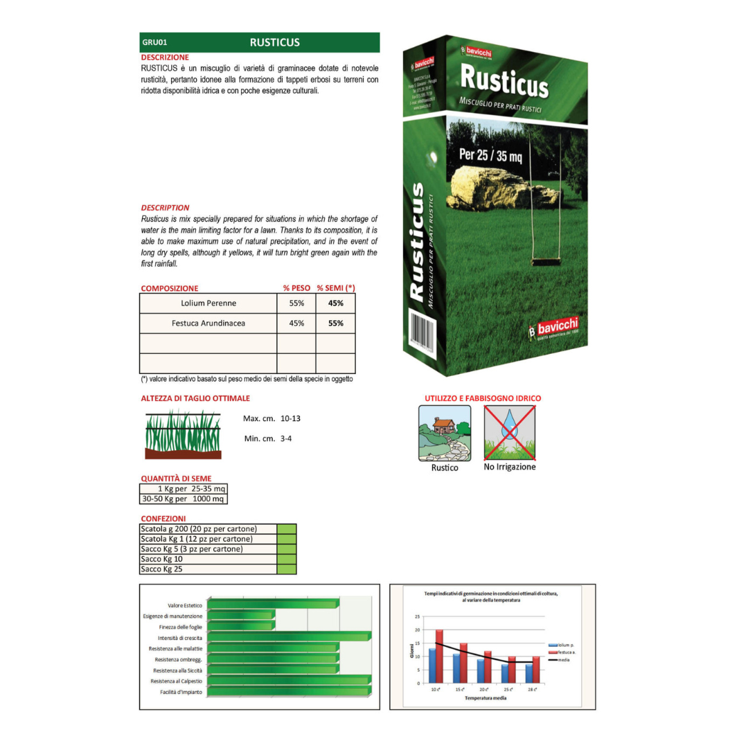 Rusticus è un miscuglio appositamente studiato per quelle situazioni in cui la carenza d'acqua è il principale fattore limitante per un tappeto erboso. Grazie alla sua composizione riesce a sfruttare al massimo le precipitazioni naturali ed in caso di protratta siccità, pur ingiallendo, è in grado alle prime piogge di riprendere un vivo colore verde.