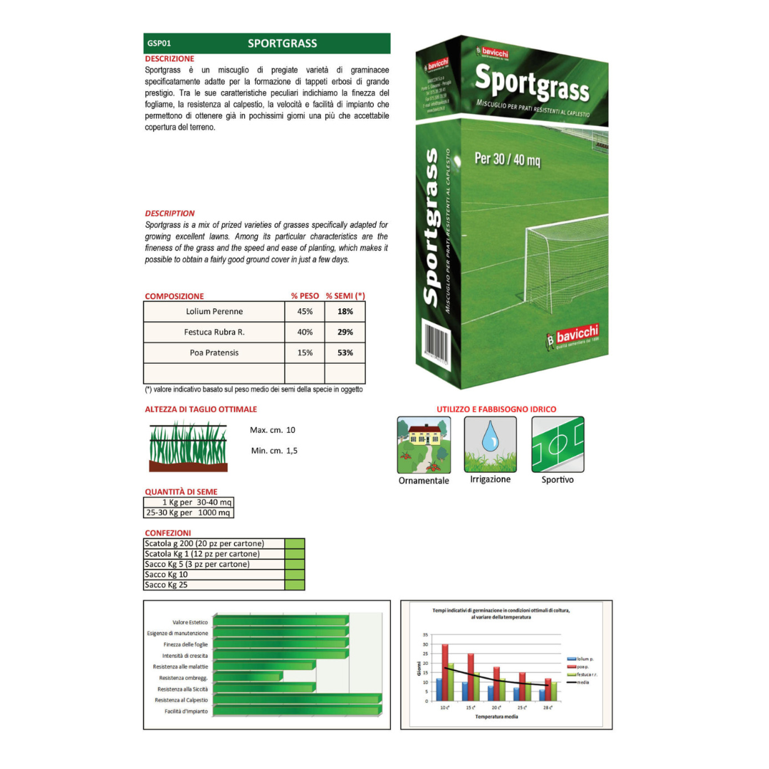 Sportgrass è un miscuglio di pregiate varietà di graminacee specificatamente adatte per la formazione di tappeti erbosi di grande prestigio. Tra le sue caratteristiche peculiari indichiamo la finezza del fogliame, la resistenza al calpestio, la velocità e facilità di impianto che permettono di ottenere già in pochissimi giorni una più che accettabile copertura del terreno.